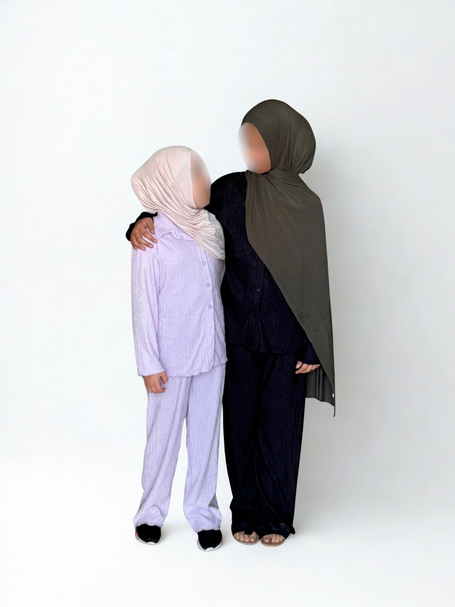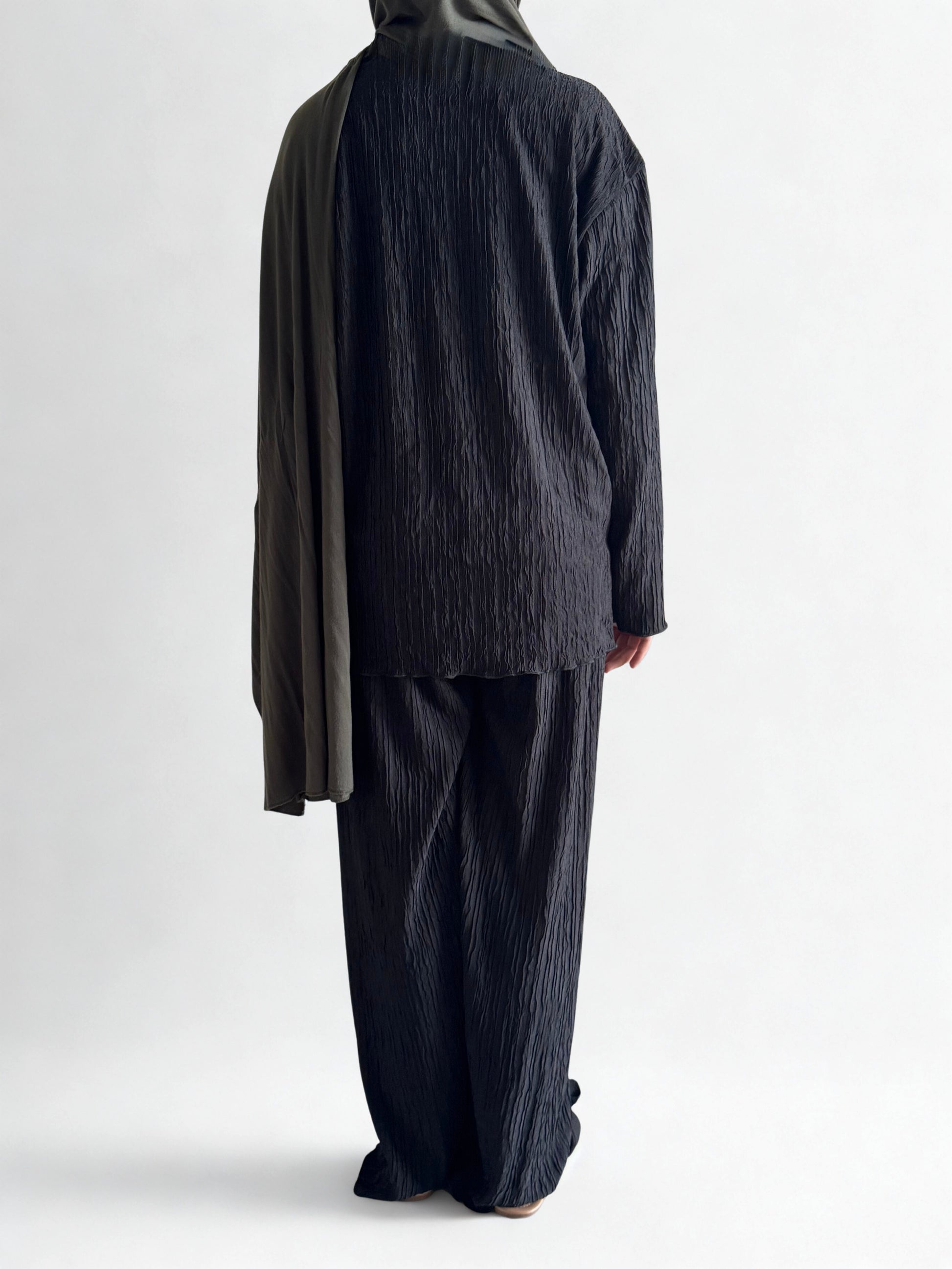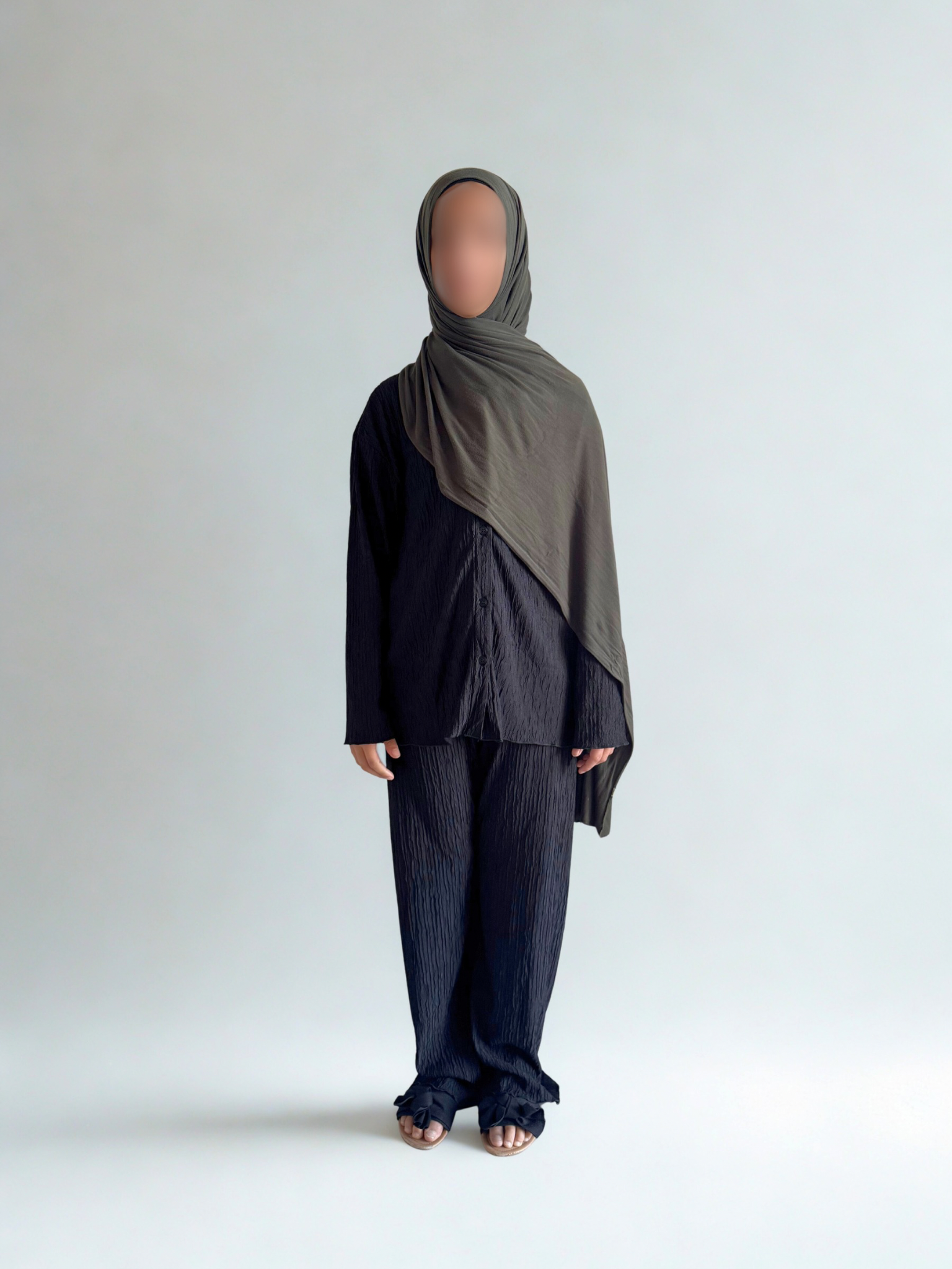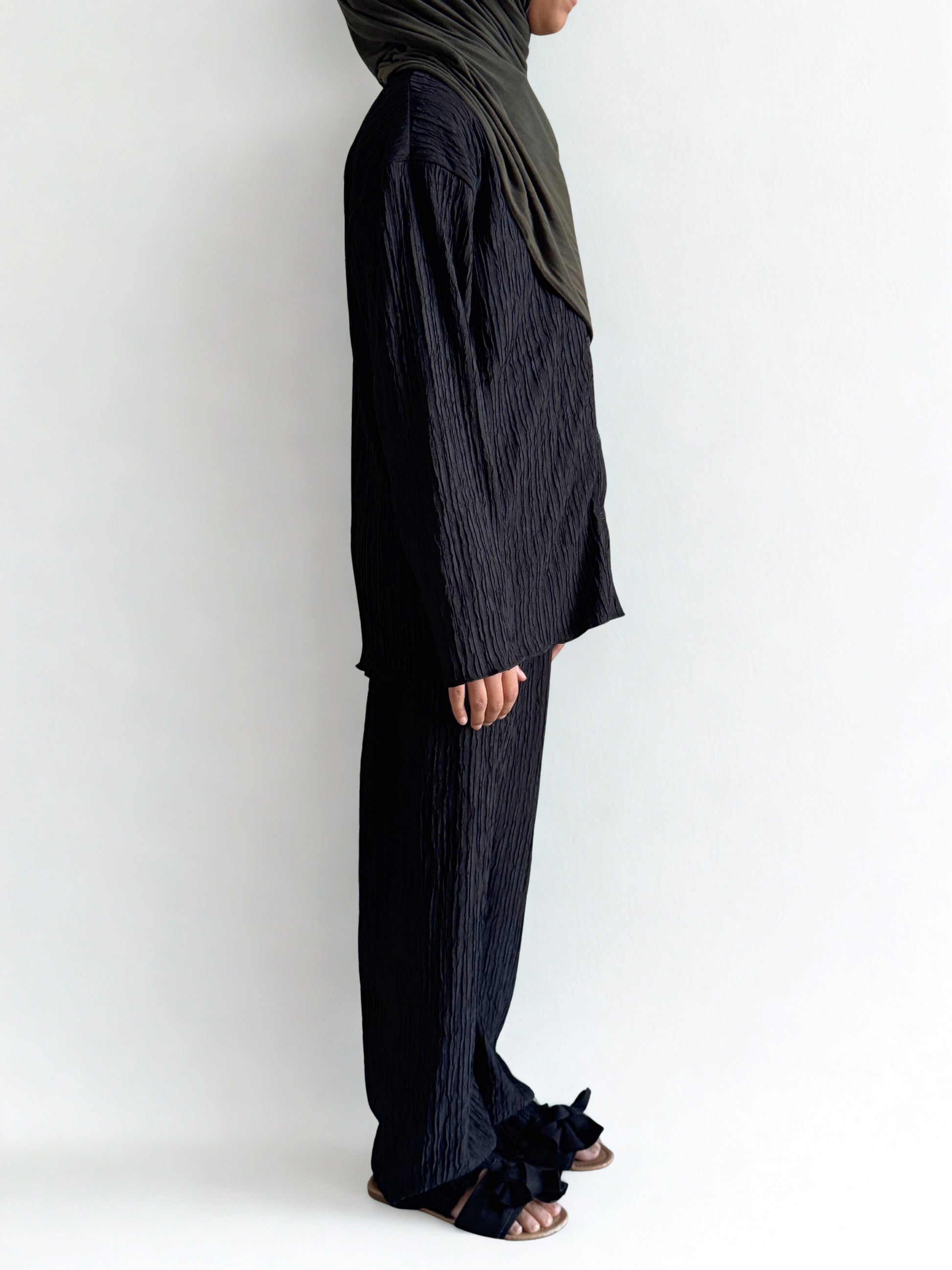Elevate your everyday modest look with our Crinkle Textured Co-ord Set — a blend of effortless style and all-day comfort. This set includes a relaxed-fit button-up top with a classic collar and matching wide-leg pants, both featuring a unique crinkle texture that adds depth and dimension to a simple silhouette.